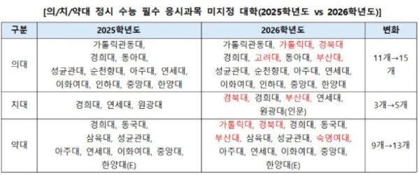 약대 역시 지정과목 폐지 대학이 4곳 추가돼, 37개 약대 중 13곳이 필수 응시과목 없이 지원을 받을 수 있게 됐다. 특히 이 중 11곳은 수도권에 위치해 최상위권 인문계 수험생들의 관심이 커질 것으로 전망된다.