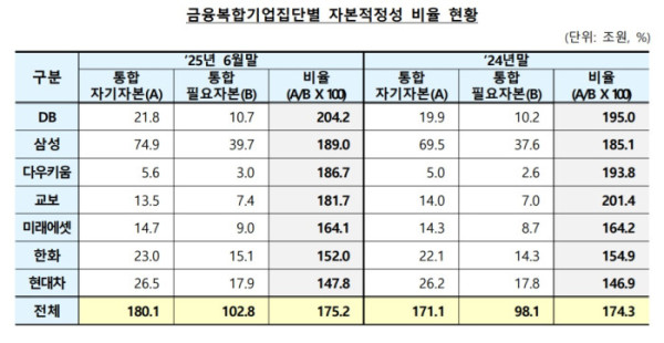 20일 금융감독원에 따르면 DB, 삼성, 다우키움, 교보, 미래에셋, 한화, 현대차 등 7개 금융복합기업집단의 6월 말 기준 자본적정성 비율은 175.2%로 집계됐다. 전년 말 174.3% 대비 0.9%p 상승한 수치다.