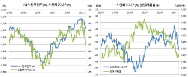 원화와 달러 등 외화를 1년이상 교환하는 시장인 통화스왑(CRS)과 변동금리와 고정금리를 교환하는 이자율스왑(IRS) 금리의 금리차를 의미하는 스왑베이시스도 1년물의 경우 –55.8bp로 7월3일(-56.3bp) 이후 4개월만에 역전폭이 확대됐다(와이든).