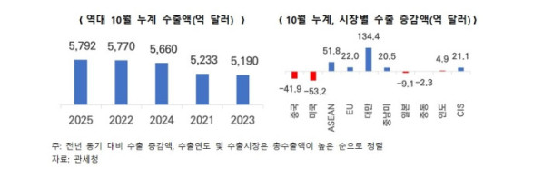 보고서에 따르면 아세안·EU·대만·중남미로의 수출 확대가 미·중 수출 감소분을 상쇄하며 시장 구조가 빠르게 재편되고 있다. 10월 말 기준 아세안(51억8000만 달러·5.5%), EU(21억2000만 달러·3.9%), 대만(135억3000만 달러·51%) 수출이 증가한 반면, 대미(−53억2000만 달러·−5%), 대중(−41억9000만 달러·−3.8%) 수출은 감소했다.