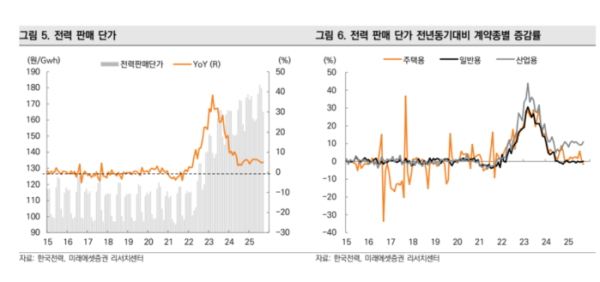 다만 전기요금 인상 가능성은 제한적이라는 분석이다. 그는 “재생에너지 확대와 전력망 투자 부담으로 요금 인상 필요성이 거론되고 있으나 유가 안정세와 정부의 물가 통제 기조를 감안하면 전면적 인상은 어려울 것”이라며 “2026년 도입 예정인 지역별 차등요금제가 실질적인 단가 인상 효과를 낼 수 있을 것”이라고 전망했다.