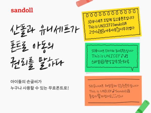 산돌이 20일 세계 어린이날을 맞아 유니세프 한국위원회와 함께 ‘유니세프 어린이 손글씨 폰트’ 3종을 공개했다.