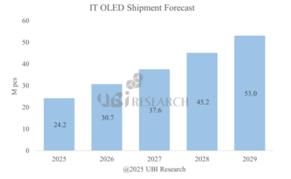 20일 유비리서치가 발간한 ‘Beyond Mobile: IT OLED 기술과 산업 분석’에 따르면 IT용 OLED 출하량은 2025년 2400만 대에서 2029년 5300만 대로 두 배 이상 확대될 전망이다. 보고서는 “OLED 기반 IT 기기 수요가 4년간 꾸준히 증가하며 시장 자체가 새로운 성장 구조로 재편되고 있다”고 분석했다.