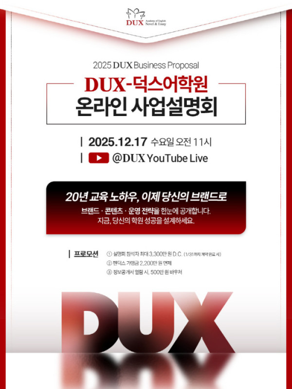 DUX-덕스어학원은 대치동 직영원을 기반으로 20여 년간 영어논술 중심 교육을 운영해왔으며 현재 전국 43개 교육특구로 입지를 다져왔다. 이번 온라인 설명회에서는 12년 53단계 커리큘럼·학생 맞춤 학습 관리 시스템·안정적인 학원 운영을 위한 본사의 지원 체계 등 실제 운영에 필요한 핵심 전략이 공개된다.