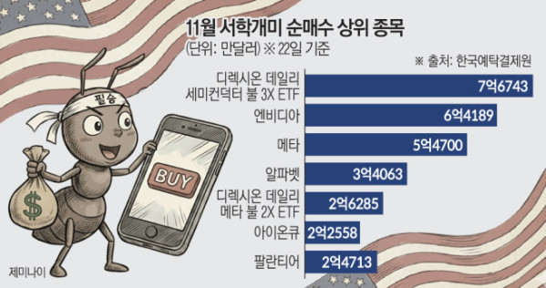 엔비디아가 회계연도 3분기(8~10월) 사상 최대 매출을 기록했지만, 미국 증시는 여전히 변동성을 나타내고 있다. 특히 대형 기술주가 이런 혼란스러운 흐름을 주도하는 중이다. 이달 들어 엔비디아는 13.53% 급락했고 메타(-6.81%), 팔란티어(-25.25%), 아이온큐(-28.58%) 등도 동반 하락했다. 서학개미는 빅테크 반등에 베팅해 저가 매수에 나선 것으로 보인다.