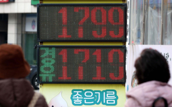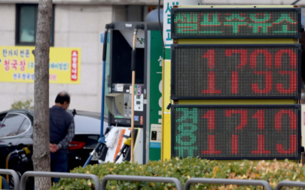 국내 주유소 휘발유와 경유의 주간 평균 가격이 4주 연속 동반 상승했다. 서울 지역 주유소의 휘발유 평균 판매 가격은 1799.1원으로 올라 1800원에 육박했다. 한국석유공사 유가정보시스템 오피넷에 따르면 11월 셋째 주(16~20일) 전국 주유소 휘발유 평균 판매가는 전주 대비 리터 당 25.8원 오른 1729.7원, 경유는 전주 대비 리터 당 38.5원 오른 1636.6원으로 나타났다. 23일 서울의 한 주유소에 유가정보가 게시돼 있다.