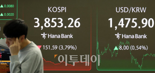 ▲미국 기술주 하락 여파로 코스피 종가가 3800선까지 밀려났다. 환율도 7개월 만에 1470원을 돌파하며 최고치를 기록했다. 21일 서울 중구 하나은행 딜링룸 전광판에 코스피 지수가 전 거래일보다 151.59포인트(3.79%) 하락한 3853.26을 나타내고 있다. 코스닥 지수는 전 거래일보다 27.99포인트(3.14%) 내린 863.95에 거래를 마감했다. 원·달러 환율은 주간 거래 종가(15시30분) 기준 전일 대비 7.7원 오른 1475.6원을 기록했다. 고이란 기자 photoeran@ (이투데이DB)