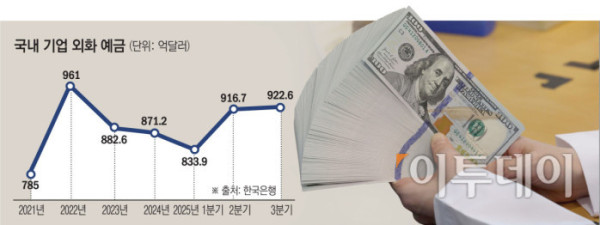 24일 한국은행에 따르면 올해 3분기 국내 기업의 외화 예금은 922억6000만 달러(약 136조 원)로 1분기 833억9000만 달러(약 123조 원), 2분기 916억7000만 달러(약 135조 원) 대비 각각 10.6%, 0.6% 늘었다. 고환율이 이어질 거라는 전망 속에 기업들이 외화 보유 기조를 이어가고 있다.