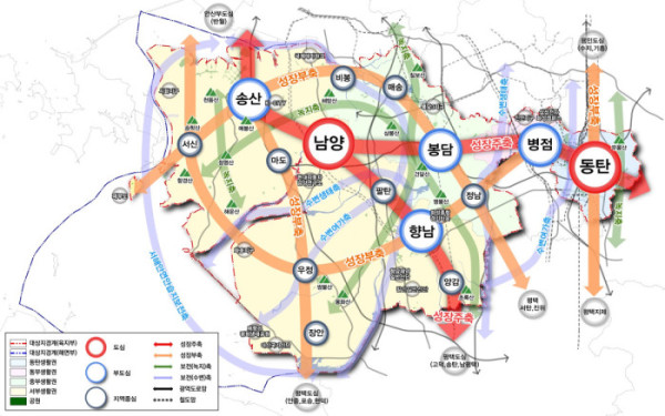 △동탄생활권은 신산업 생태계 구축과 친환경 생태도시 기반 마련 △동부생활권은 광역환승거점 조성과 원도심 정비·관광산업 육성 △중부생활권은 산·학·연 네트워크 기반의 녹색관광벨트 구축 △서부생활권은 자동차·바이오 등 신성장산업 클러스터와 해양관광산업 확대