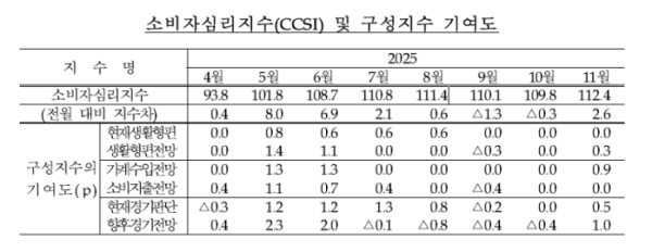 11월 소비자심리지수(CCSI)가 112.4로 전월보다 2.6포인트 상승하며 2017년 11월 이후 최고치를 기록했다. 한미 관세협상 타결과 3분기 GDP 성장률이 전망치를 상회하는 등 주요 불확실성이 줄어들면서 소비자들의 경기 체감이 크게 개선된 것으로 나타났다