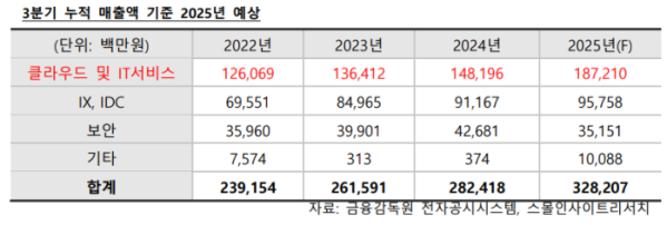 이 연구원은 "동사는 '자체 부지(과천 IDC)에 자체 인프라(데이터센터)를 구축하고, 자체 IX 네트워크(도로)를 보유한 국내 유일의 사업자로, 이를 통해 압도적인 원가 경쟁력을 확보했다"라며 "올해를 기점으로 생산능력(CAPEX) 부담이 크게 완화되는 가운데, AI 산업 성장과 함께 자회사 실적이 연결 재무제표에 본격 반영되기 시작하면 시장의 재평가도 가속화될 가능성이 크다"라고 밝혔다.