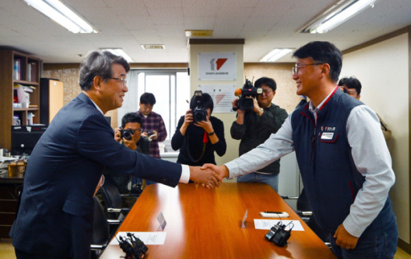 ▲김지형(오른쪽) 경제사회노동위원회 위원장이 25일 서울 중구 전국민주노동조합총연맹을 찾아 양경수 민주노총 위원장과 회동하고 있다. 경사노위와 민주노총의 공식적인 만남은 민주노총이 1999년 2월 경사노위의 전신인 노사정위원회를 탈퇴한 뒤 26년 만이다. 신태현 기자 holjjak@