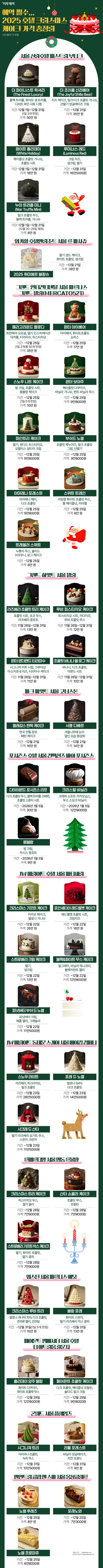 고가임에도 예약 문의는 이미 쏟아지고 있는데요. 더 주저하다간 실물 영접이 어려울 수 있죠. 2025년 크리스마스 테이블을 책임질 주요 호텔 케이크를 그래픽으로 정리했습니다.