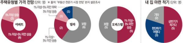 주택유형별 매매가격 전망을 봐도 이런 견해가 고스란히 반영됐다. 아파트는 전문가 10명 모두 상승(1% 이상~5% 미만 8명, 5% 이상 2명)을 예상했으나 빌라는 3명(1% 이상~5% 미만 2명, 5% 이상 1명)에 불과했다. 나머지 7명 중 6명은 보합, 1명은 5% 미만 하락으로 응답했다. 오피스텔은 보합과 1% 이상~5% 미만 상승이란 응답이 각각 절반으로 나뉘었다.