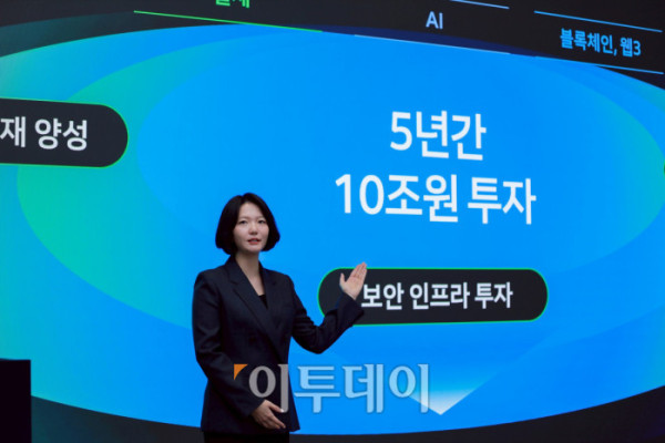 ▲최수연 네이버 대표이사가 27일 경기도 성남시 분당구 네이버 1784에서 열린 네이버-네이버파이낸셜-두나무 3사 공동 기자간담회에서 발표를 하고 있다. 사진제공=네이버