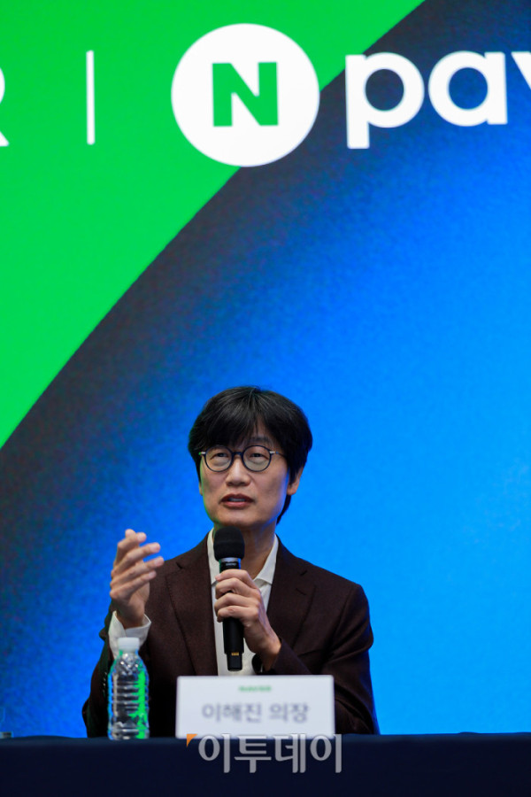 ▲이해진 네이버 이사회 의장이 27일 경기도 성남시 분당구 네이버 1784에서 열린 네이버-네이버파이낸셜-두나무 3사 공동 기자간담회에서 취재진의 질문에 답변하고 있다. 사진제공=네이버