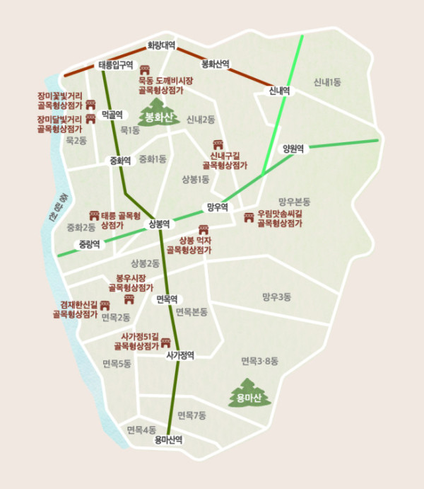 올해 중랑구는 골목형상점가 이용 환경을 개선하기 위해 다양한 기반 시설을 정비했다. ‘상봉먹자 골목형상점가’에는 화재 알림 시설을 설치하여 안전성을 강화했고, 봉우시장 골목형상점가에는 지주식 간판을 새롭게 설치하고 도로 디자인 포장을 추진해 골목형상점가의 이미지를 개선했다.