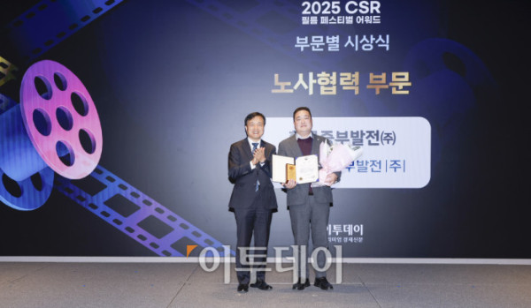 ▲27일 서울 강남구 더 웨스틴 서울 파르나스 호텔에서 열린 '2025 CSR 필름 페스티벌 어워드’에서 이인혁(오른쪽) 한국중부발전 홍보실장이 권태성 서울지방고용노동청장에게 고용노동부 장관상 노사협력 부문을 수상한 뒤 기념촬영을 하고 있다. 경제신문 이투데이가 주최한 이 행사는 한 해 동안 사회적 가치 창출을 위한 CSR 활동 발자취를 공모하고 그 업적을 격려하기 위해 마련된 자리로 2012년 첫걸음을 내디뎌 올해로 14회째를 맞이했다. 조현호 기자 hyunho@