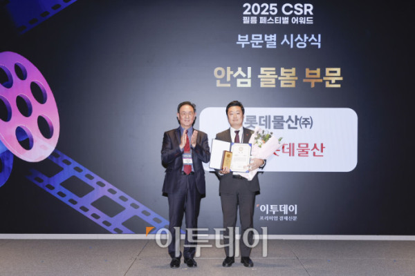 ▲27일 서울 강남구 더 웨스틴 서울 파르나스 호텔에서 열린 '2025 CSR 필름 페스티벌 어워드’에서 서규하(오른쪽) 롯데물산 부문장이 이종재 이투데이그룹 부회장에게 서울특별시장상 안심 돌봄 부문을 수상한 뒤 기념촬영을 하고 있다. 경제신문 이투데이가 주최한 이 행사는 한 해 동안 사회적 가치 창출을 위한 CSR 활동 발자취를 공모하고 그 업적을 격려하기 위해 마련된 자리로 2012년 첫걸음을 내디뎌 올해로 14회째를 맞이했다. 조현호 기자 hyunho@
