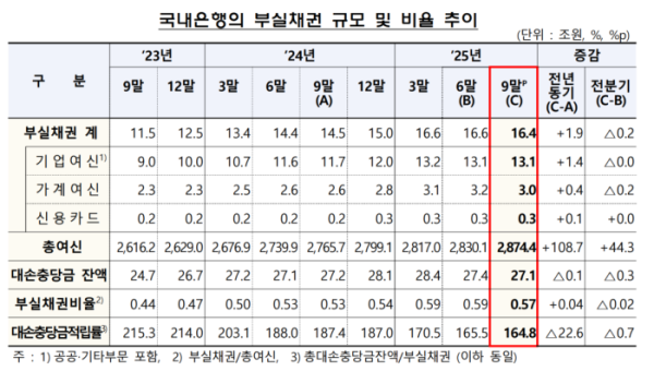 금감원은 경기 둔화와 대내외 불확실성 지속에 대비해 연체·부실 위험이 확대될 가능성을 예의주시한다는 방침이다. 아울러 부실채권 상·매각 및 충당금 확충을 통해 충분한 손실흡수능력을 유지하도록 은행권에 관리 강화를 지속 유도할 계획이다.