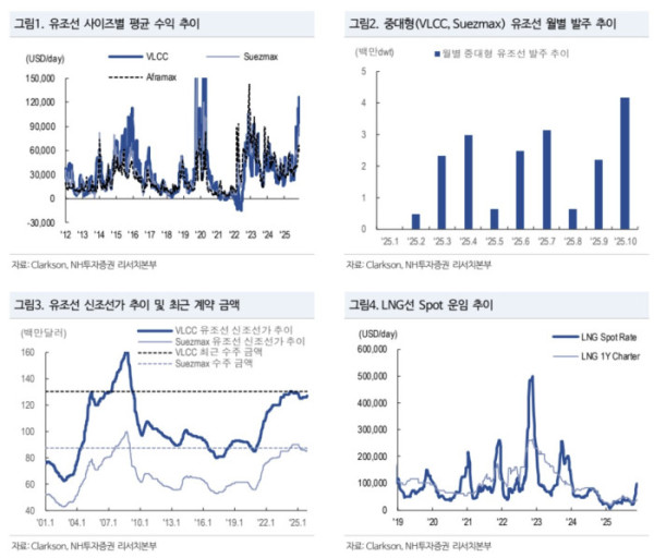그는 “이달 HD현대삼호가 수주한 초대형 유조선(VLCC)이 척당 1억3020만 달러에 계약되며 선가 상승 흐름을 재확인했다”며 “대한조선과 대한조선도 각각 최근 Suezmax급 유조선을 척당 8740만 달러에 수주해 가격 반등 모멘텀이 증명됐다”고 했다.