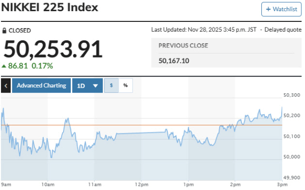 닛케이225지수는 4거래일 연속 상승했다. 다만 전날 뉴욕증시가 추수감사절로 휴장하고 28일도 단축 거래로 진행되는 터라 일본증시에도 시장 참가자가 부족해 방향감이 약했다고 니혼게이자이신문(닛케이)은 설명했다.
