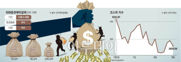국내 증시 부진도 해외 쏠림을 부추겼다. 11월 코스피는 4221.87(3일)에서 3926.59(28일)로 300포인트 넘게 떨어졌다. AI·빅테크 실적 호조로 상승세를 이어간 미국 시장과 명확히 대비되면서 “미국 시장이 국내 시장보다 낫다”는 개인 심리가 강해졌다는 평가다.