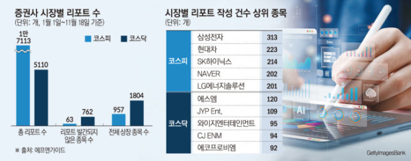 같은 기간 작성된 리포트 수도 유가증권시장 1만7113개, 코스닥시장 5110개로 세 배 이상 격차를 보였다. 두 개 시장을 통틀어 리포트가 가장 많이 작성된 종목은 삼성전자로 313개 자료가 발간됐다. 그 뒤를 현대차(223개), SK하이닉스(214개), NAVER(202개) 등이 이었다. 코스피 종목 중에서도 대형주를 중심으로 리포트 작성 건수가 컸다.