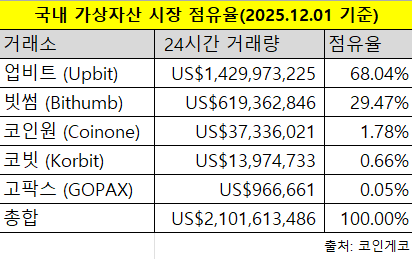 1일 코인게코에 따르면 24시간 거래량 기준 업비트의 국내 가상자산 시장 점유율은 68.04%로 집계됐다. 빗썸이 29.47%로 뒤를 잇고 있으나 격차는 여전히 크다. 나머지 약 2.5%를 코인원(1.78%), 코빗(0.66%), 고팍스(0.05%)가 나눠 가지며 사실상 양강 체제가 공고해지는 분위기다. 이 가운데 업비트 운영사 두나무와 네파의 합병이 공식화되면서 시장 판도 변화가 본격화되고 있다. 양사는 글로벌 결제·금융 시장으로의 확장을 목표로 인공지능(AI)과 블록체인을 결합한 통합 금융 플랫폼 구축을 제시했다.