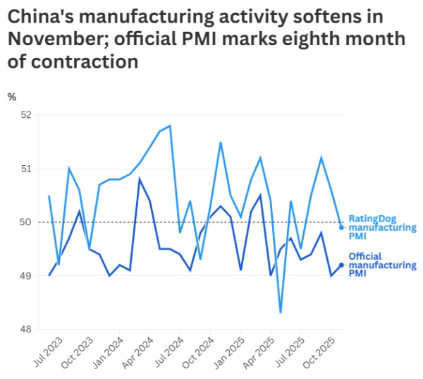 전날 중국 정부가 발표한 11월 제조업 PMI도 49.2를 기록했다. 10월(49.0)보다 소폭 개선됐지만, 8개월째 위축 국면에서 벗어나지 못했다.