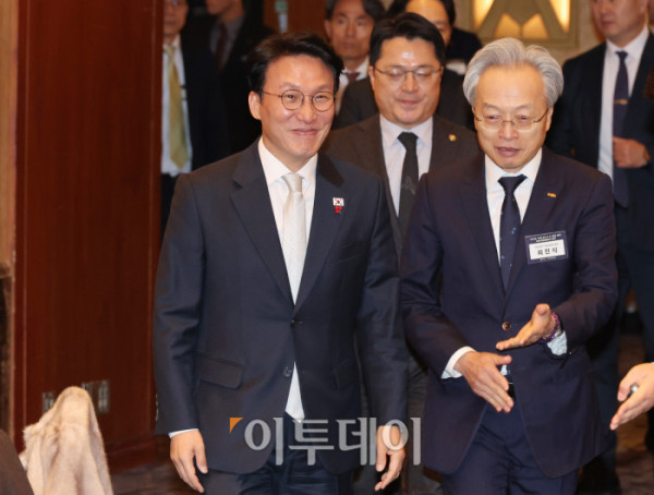 ▲김민석(왼쪽) 국무총리와 최진식 한국중견기업연합회 회장을 비롯한 내빈들이 1일 서울 중구 롯데호텔에서 열린 제11회 중견기업인의 날 기념식에 참석하기 위해 들어서고 있다. 청사사진기자단