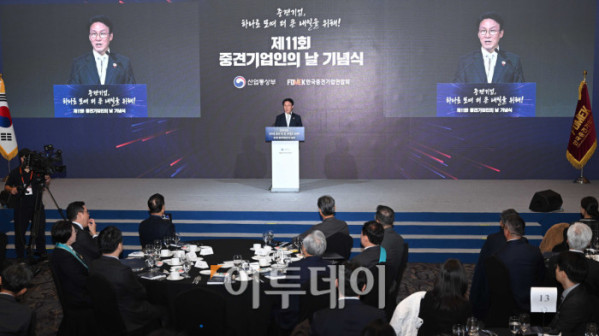 ▲김민석 국무총리와 최진식 한국중견기업연합회 회장이 1일 서울 중구 롯데호텔에서 열린 제11회 중견기업인의 날 기념식에 참석해 박수를 치고 있다. 청사사진기자단