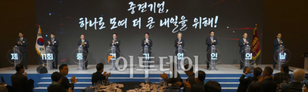 ▲최진식 한국중견기업연합회 회장이 1일 서울 중구 롯데호텔에서 열린 제11회 중견기업인의 날 기념식에서 개회사를 하고 있다. 청사사진기자단