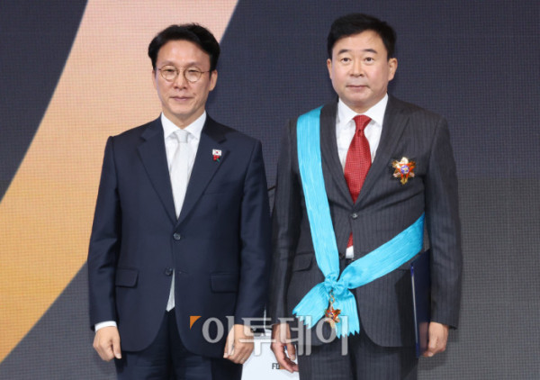 ▲김민석(왼쪽) 국무총리가 1일 서울 중구 롯데호텔에서 열린 제11회 중견기업인의 날 기념식에서 이동현 오상헬스케어 회장에게 금탑산업훈장을 수여한 뒤 기념촬영을 하고 있다. 청사사진기자단