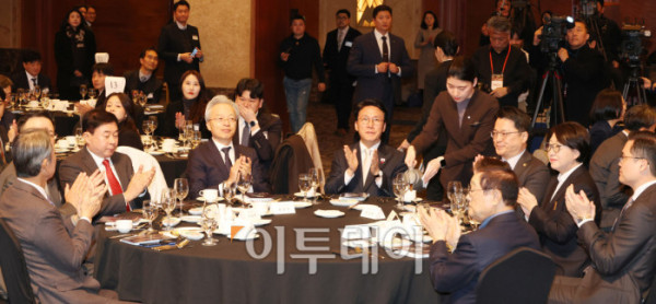 ▲김민석(왼쪽 네 번째) 국무총리와 최진식(왼쪽 다섯 번째) 한국중견기업연합회 회장을 비롯한 내빈들이 1일 서울 중구 롯데호텔에서 열린 제11회 중견기업인의 날 기념식에서 퍼포먼스를 마친 후 박수를 치고 있다. 왼쪽부터 송시한 와이지원 대표이사, 김종운 알레르망 대표이사, 박재규 동아엘텍 대표이사, 문신학 산업통상부 1차관, 김 국무총리, 최 중견련 회장, 최명배 와이씨 대표이사, 박인주 제니엘 회장, 장경빈 에프에스티 대표이사. 청사사진기자단