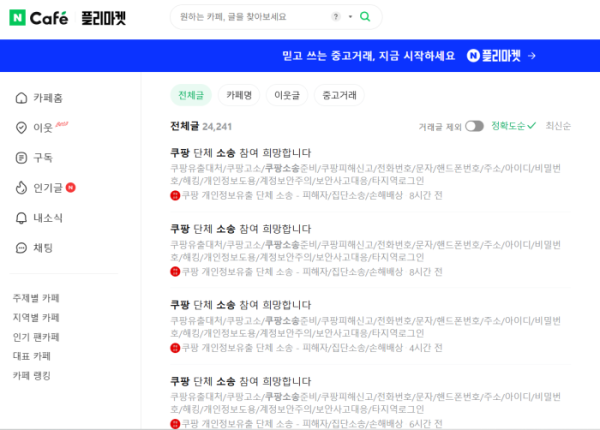 피해자를 중심으로 단체 소송에 나서겠다는 움직임도 나타나고 있다. 네이버에서는 ‘쿠팡 해킹 피해자 집단 소송 카페’라는 이름의 카페가 개설돼 ‘쿠팡 단체 소송 신청 희망합니다’라는 글이 빠르게 늘고 있다.