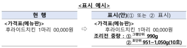 이에 식품의약품안전처는 15일부터 식품위생법 시행규칙 유권해석을 통해 치킨 중량 표시의무제를 도입하기로 했다. 앞으로 치킨 전문점은 치킨의 '조리 전 총 중량'을 그램(g) 또는 '호' 단위로 메뉴판 가격 근처에 병기해야 한다. 다만 해당 의무는 모든 치킨전문점이 아니라 10대 치킨 가맹본부 소속 가맹점 약 1만2560곳에 부과된다. 중량 표시의무제 도입 대상이 된 10대 치킨 프랜차이즈는 가맹점 수 기준으로 BHC, BBQ치킨, 교촌치킨, 처갓집양념치킨, 굽네치킨, 페리카나, 네네치킨, 멕시카나치킨, 지코바치킨, 호식이두마리치킨 등이다.