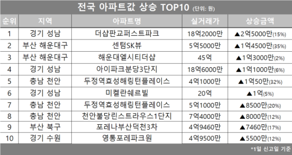 이어 경기 성남시 ‘아이파크분당3단지’가 18억6000만 원에 거래돼 6% 상승했고 충남 천안시 ‘두정역효성해링턴플레이스’는 4억1000만 원에 거래되며 32% 올라 5위에 이름을 올렸다.