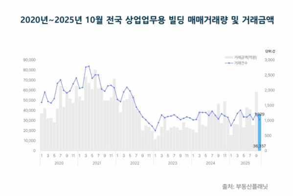 ▲2020년~2025년 10월 전국 상업업무용 빌딩 매매거래량 및 거래금액. (사진제공=부동산플래닛)