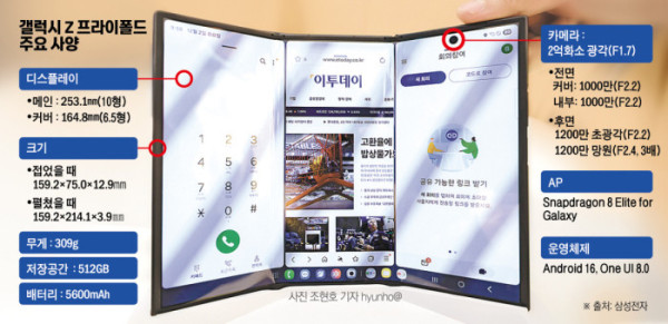 배터리는 5600mAh로 삼성 폴더블 중 최대 용량이다. 김성은 부사장은 “3개 영역에 배터리를 균등 배분하고 전력 효율을 극대화했다”며 “대화면 구조에도 불구하고 폴드7과 동급 수준의 실사용 시간을 제공한다고 말했다.