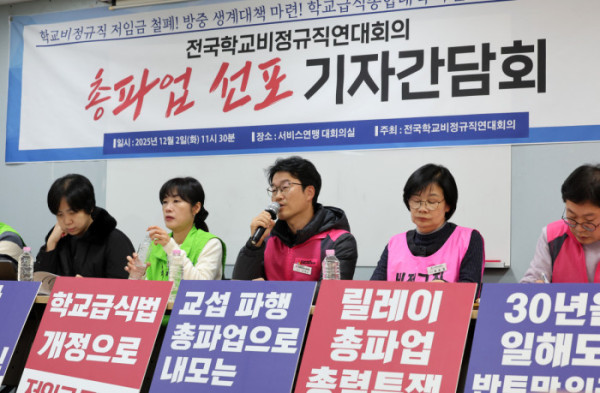 이날 연대회의는 “학교는 교육 현장이자 노동자의 일터지만 급식실 조리 종사자 15명이 산재로 목숨을 잃었고, 30년 근무해도 정규직의 절반 수준 임금을 받는 구조적 차별이 지속되고 있다”며 “급식실을 안전한 일터로 만들고 비정규직 차별을 해소하기 위해 총파업에 나선다”고 밝혔다.