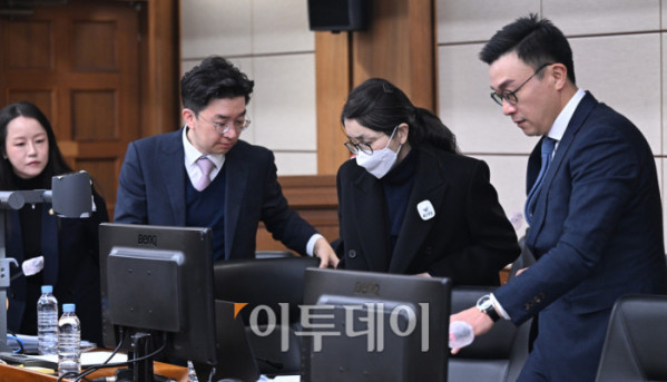 ▲도이치모터스 주가조작과 명태균 공천개입, 통일교 청탁·뇌물 수수 의혹 혐의 등으로 구속기소 된 김건희 씨가 3일 서울 서초구 서울중앙지방법원에서 열린 자본시장법 위반 혐의 결심 공판에 출석해 변호인과 대화하고 있다. 사진공동취재단