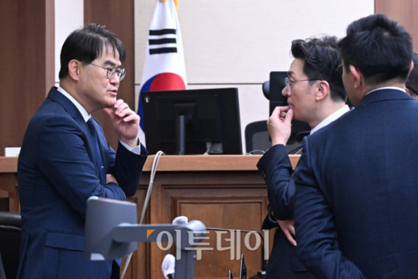 ▲김건희 여사의 각종 의혹을 수사하고 있는 민중기 특별검사팀 김형근 특별검사보(왼쪽)가 3일 서울 서초구 서울중앙지방법원에서 열린 김 여사의 자본시장법 위반 혐의 결심 공판에 출석해 김 여사 측 변호인다과 대화하고 있다. 사진공동취재단