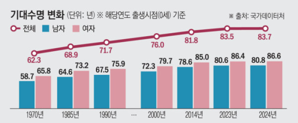 국가데이터처가 3일 발표한 '2024년 생명표'에 따르면 지난해 출생아 기대수명은 83.7년으로 전년 대비 0.2년 증가했다. 10년 전인 2014년(81.8세) 대비로는 1.9년 증가했다. 기대수명은 매년 증가세를 이어가다 코로나19 여파로 2022년(82.7년·-0.9년) 첫 감소했지만, 2023년(83.5년·+0.8년) 증가 전환 이후 2년 연속 늘어났다.