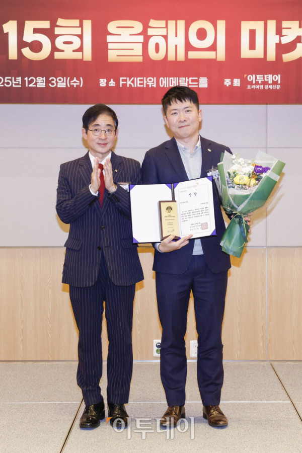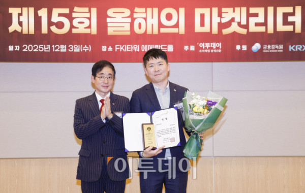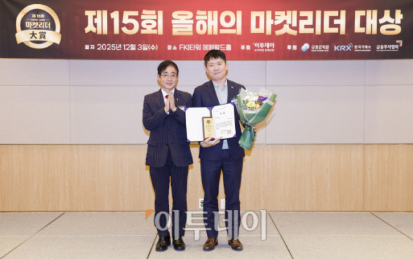 ▲3일 서울 영등포구 FKI타워 컨퍼런스센터 에메랄드홀에서 열린 '제15회 이투데이 올해의 마켓리더 대상’ 시상식에서 퇴직연금 부문 한국금융투자협회장상을 수상한 정효영(오른쪽) 미래에셋증권 연금컨설팅본부장이 시상자인 김진억 한국금융투자협회 상무와 기념촬영을 하고 있다. ‘이투데이 올해의 마켓리더 대상’은 한 해를 마무리하며 증권업계를 이끈 마켓리더들의 노력과 성과를 고취하고, 금융투자 업계의 발전과 건전한 투자 문화 정착을 위한 시장 분위기를 조성하고자 진행되는 행사다. 조현호 기자 hyunho@