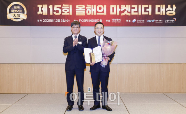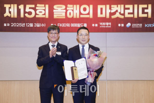 ▲3일 서울 영등포구 FKI타워 컨퍼런스센터 에메랄드홀에서 열린 '제15회 이투데이 올해의 마켓리더 대상’ 시상식에서 IPO 부문 한국거래소이사장상을 수상한 나유석(오른쪽) 대신증권 IPO본부장이 시상자인 김기영 한국거래소 부이사장과 기념촬영을 하고 있다. ‘이투데이 올해의 마켓리더 대상’은 한 해를 마무리하며 증권업계를 이끈 마켓리더들의 노력과 성과를 고취하고, 금융투자 업계의 발전과 건전한 투자 문화 정착을 위한 시장 분위기를 조성하고자 진행되는 행사다. 조현호 기자 hyunho@