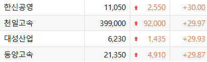 천일고속과 동양고속은 각각 29.97%, 29.87% 급등했다. 서울고속버스터미널 재개발 기대감의 영향을 받은 것으로 보인다. 천일고속은 신세계그룹 계열사인 신세계센트럴시티(지분율 70.49%)에 이어 서울고속버스터미널 지분 16.67%를 보유한 2대 주주다. 동양고속은 서울고속버스터미널 지분 0.17%를 보유하고 있다.