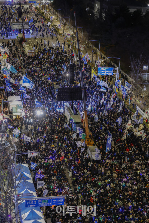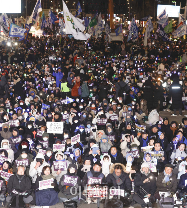 ▲3일 서울 여의도 국회 앞에서 열린 12.3 내란외환 청산과 종식, 사회대개혁 시민대행진에서 시민들이 구호를 외치고 있다. 조현호 기자 hyunho@