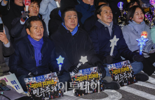 ▲더불어민주당 정청래(왼쪽부터) 대표와 김병기 원내대표, 조국 조국혁신당 대표가 3일 서울 여의도 국회 앞에서 열린 12.3 내란외환 청산과 종식, 사회대개혁 시민대행진에 참석해 있다. 조현호 기자 hyunho@