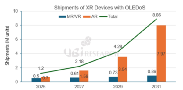 유비리서치 노창호 애널리스트는 “OLEDoS 시장은 공급망 확대와 수요 다변화를 기반으로 2025년 2억8500만달러에서 2031년 8억4000만달러 규모로 성장할 것”이라고 전망했다. 그는 이어 “OLEDoS 탑재 XR 기기 출하량도 2025년 120만 대에서 2031년 886만 대로 증가하며, 같은 해 AR 기기가 전체 OLEDoS 출하량의 약 90%를 차지할 것”이라고 분석했다.